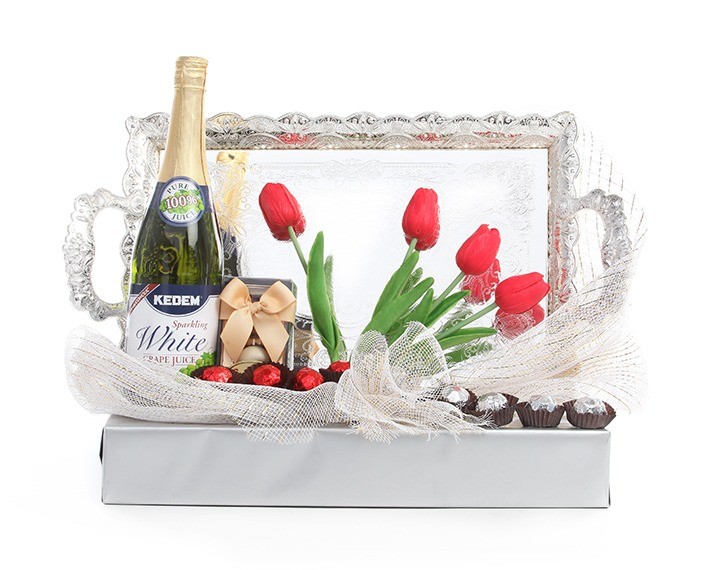 An Elegant silver plated serving tray decorated with silk flowers and chocolates